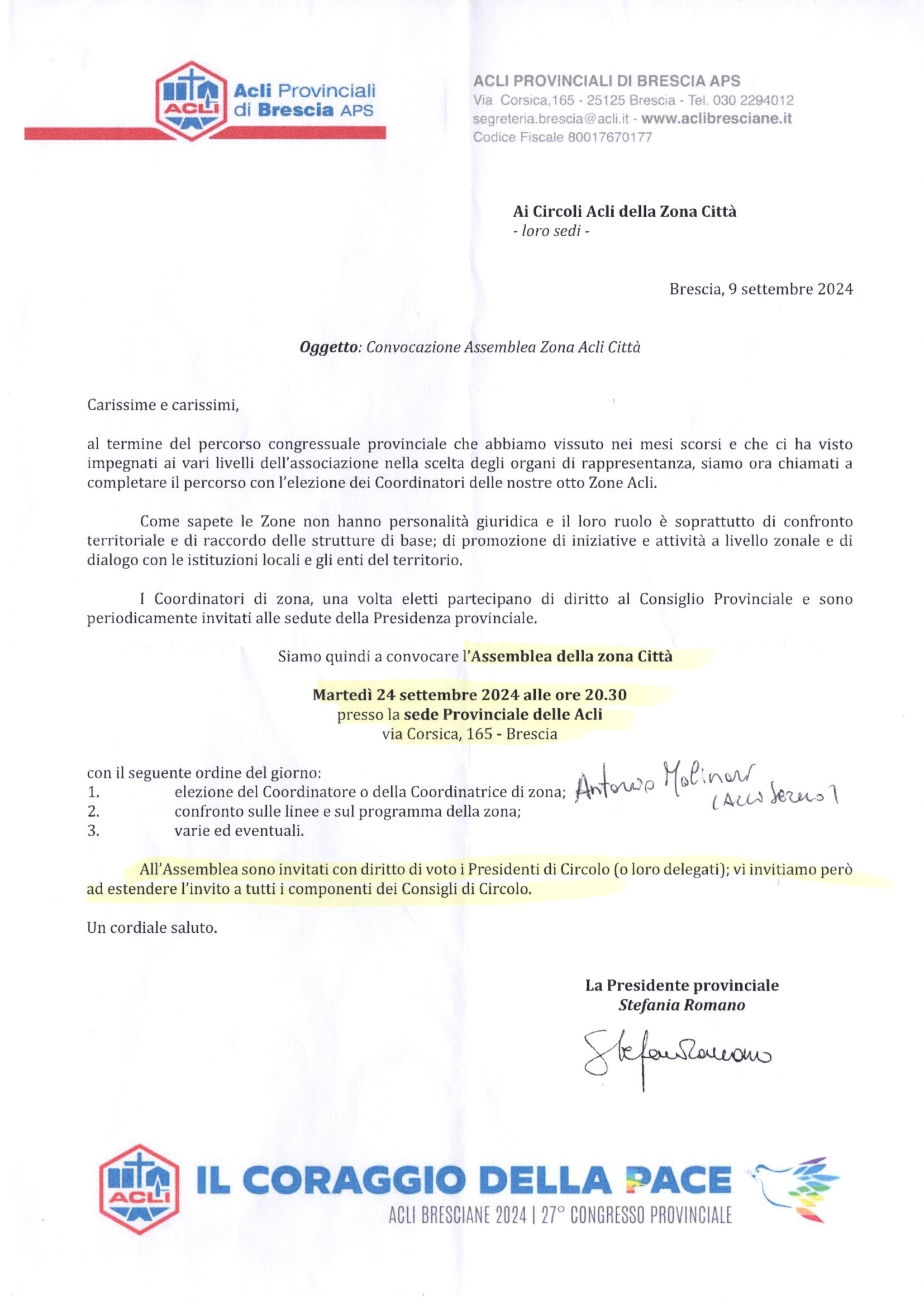all'assemblea dei soci Acli città che si terrà 11 giugno 2024